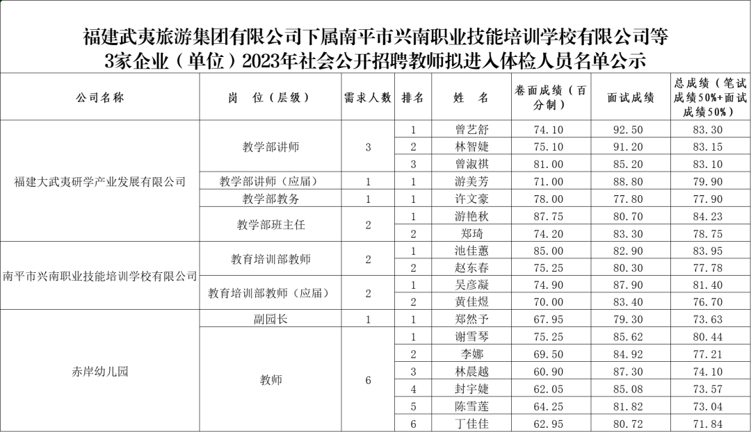 現(xiàn)將福建武夷旅游集團有限公司下屬南平市興南職業(yè)技能培訓(xùn)學(xué)校有限公司等3家企業(yè)(單位)2023年社會公開招聘教師擬進入體檢人員名單予以公示,公示期為2023年9月4日-9月6日。公示期間若有疑異,請向福建武夷旅游集團有限公司反映。